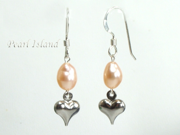 Small Peach Oval Pearl with Tiny Silver Heart Earrings