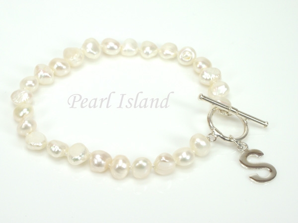 Personalised White Baroque Pearl Bracelet with T-bar Clasp - Beautiful baroque pearls. This high lustre pearl bracelet has a sterling silver T-bar clasp, which is very easy to use.  It can be personalised by adding silver puffed heart and initials. Attractive and special.